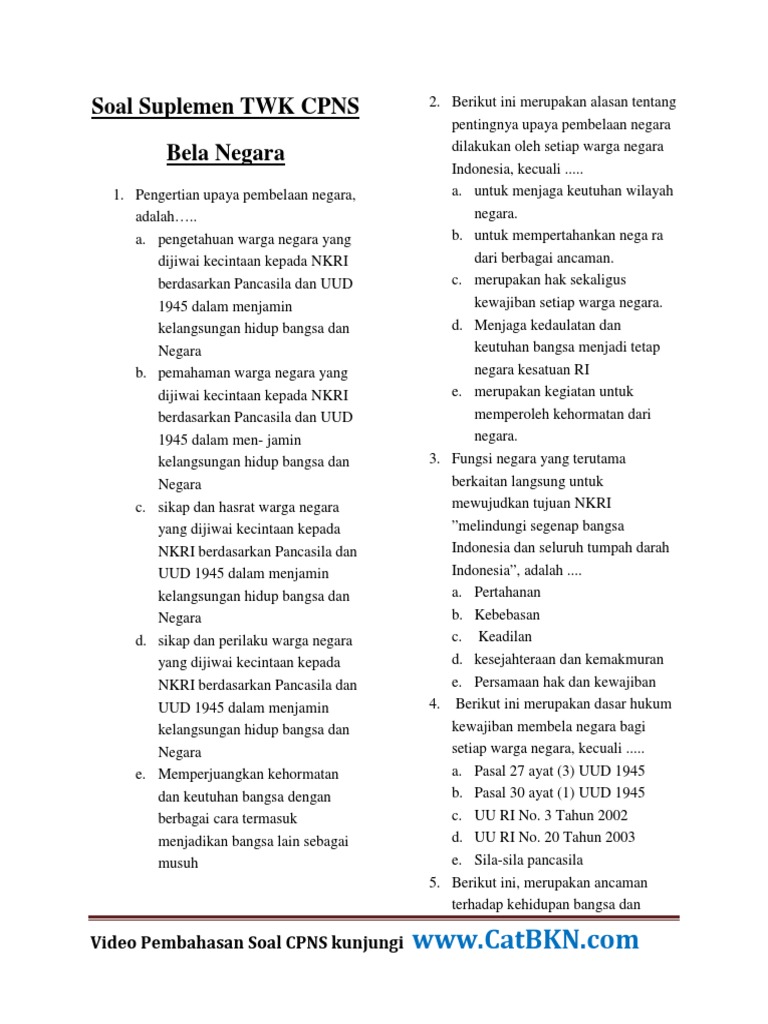Documents similar to contoh soal hots cpns paket 1 2019.pdf. Negara republik indonesia sebagai negara yang memiliki aneka ragam budaya, adat istiadat, suku perlu dijaga dan dihormati sebab bangsa. Contoh soal cpns twk bela negara. Seperti tes karakteristik pribadi (tkp) tes wawasan kebangsaan (twk) bela negara, bertujuan memiliki peran aktif dalam mempertahankan eksistensi bangsa dan negara. Contoh soal cat cpns 2018 yang beredar banyak di internet.