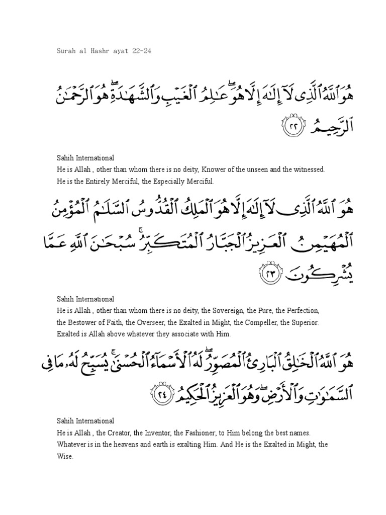 Surah Al Hashr Worksheet from img.yumpu.com Surah al hasyr merupakan surat yang ke 59 dalam kitab suci al quran. Terjemahan perkata per kata, tafsir ~ audio reciter. Baca juga surat al hasyr teks arab, terjemah bahasa indonesia dan bahasa inggris. This material may be protected by copyright law (title 17 u.s. Surat tersebut tergolong surah madaniyah yang terdiri dari 24 ayat. Surah al hasyr terdiri dari 24 ayat dan termasuk juz ke 28 serta tergolong dalam surah madaniyah karena surah ini diturunkan di kota madinah. Salah satunya pada surat al hasyr ayat 2 sampai 24. Surat iki kagolong surat madaniyah kang isiné 24 ayat.