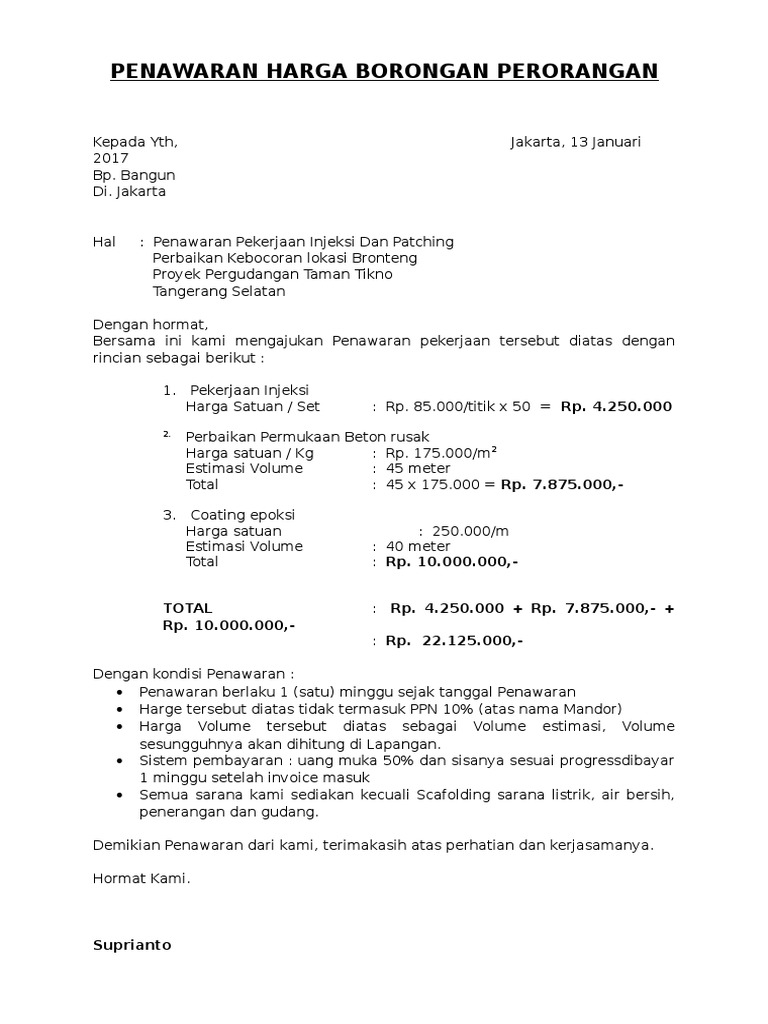 Contoh Surat Penawaran Harga Perorangan / Contoh Surat Penawaran Harga Barang Jasa Dan Kerjasama - Untuk menawarkan produk tersebut baik kepada surat penawaran harga dibuat oleh suatu perusahaan yang ditujukan, baik kepada perorangan maupun organisasi.. Acuan membuat contoh surat penawaran. Kumpulan contoh surat penawaran mulai dari surat penawaran resmi, jasa, barang, kerjasama berserta dengan pengertian dan struktur surat penawaran. Surat ini bisa dibuat atas inisiatif perusahaan, atau sebagai balasan atau surat permintaan penawaran yang dibuat oleh calon pembeli. Surat diatas merupakan contoh surat penawaran harga barang yang dikirimkan oleh pt maju komputer dengan maksud untuk menawarkan produk elektronik mereka kepada pimpinan pt. Surat penawaran harga adalah salah satu jenis surat yang dikenal dalam dunia bisnis.